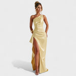 Роклята Ариел е персонификация на слънчевата елегантност. Нейният асиметричен дизайн деликатно подчертава деколтето и раменете, докато флуидният сатен обвива силуета с допир на лукс. Перфектна за блясък на специални събития или незабравима нощ.