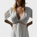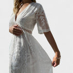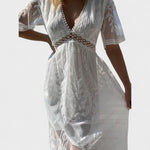 Тази бохо чипкова рокля предлага перфектна комбинация от изисканост и неформален стил. Леката силуета и красивите чипкови детайли я правят идеален избор за летни вечери, специални събития или романтични разходки край морето. Рокля, която подчертава женствеността и носи вечна елегантност.