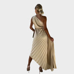 Набръчканите рамена придават на тази рокля изискан и бляскав вид. Идеална е за специални поводи, когато искате да подчертаете своята изтънчена страна.