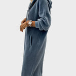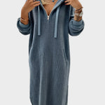 Тази рокля съчетава изключителен комфорт с модерен дизайн. Леката текстура и свободният силует осигуряват свобода на движение и усещане за уют през целия ден. Практичният качулка и джобовете добавят функционалност, която прави всяко носене приятно и удобно.