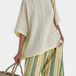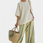 Естествено, свежо и с морско усещане. Комплект Дейзи в маслинени и светложълти нюанси комбинира широка блуза от бамбуков лен с панталони с вертикални райета, предлагащи релаксирана естетика с елегантен и светъл акцент.