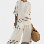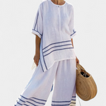Салопета Дейзи предлага перфектен баланс между удобство и средиземноморски стил. Изработена от лека смес от памук и лен, нейната широка силуета с дискретни отворени елементи и декоративни райета излъчва отпусната свежест.