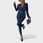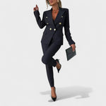 Софистициран комплект, създаден за жени, които искат да изглеждат професионално и уверено. Двуредното сако с декоративни копчета оформя талията и придава перфектна структура, докато тесните панталони с цигарен крой, дължина до глезена, визуално удължават силуета. Удобната тъкан с леко разтягане следва движенията и запазва безупречен вид от сутрин до вечер. Джобовете с клапа и чистият крой го правят идеален за офис, срещи и тържествени поводи — носете го като комплект или отделно.