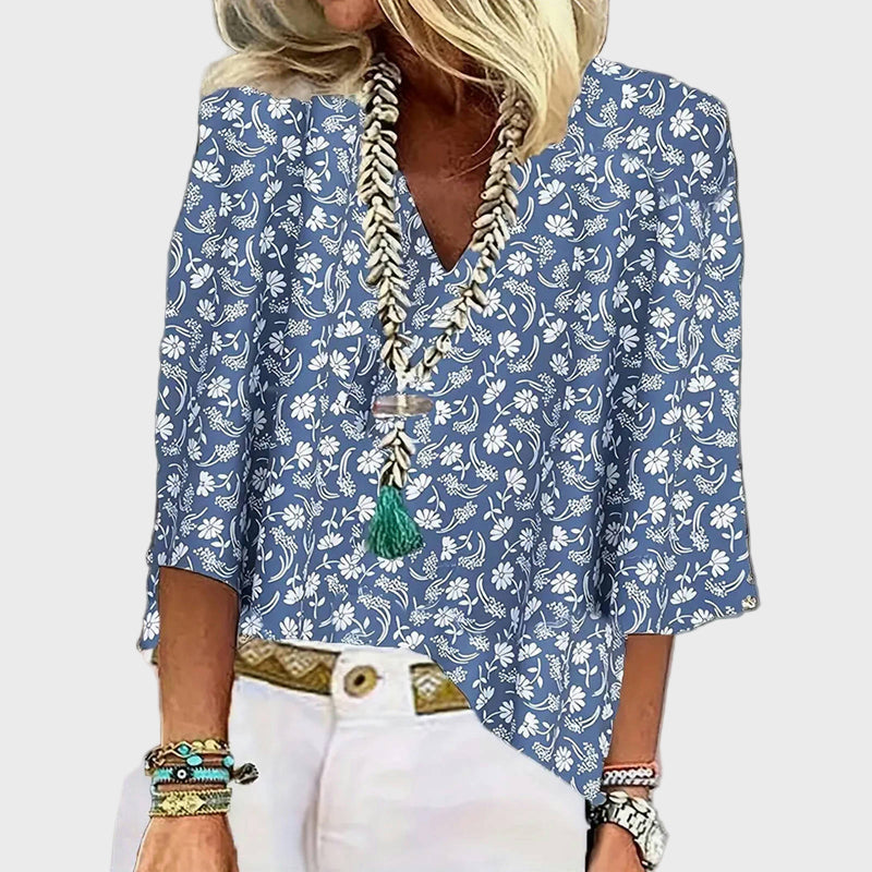 Освежете ежедневното си облекло с тази тениска в синьо, украсена с малки бели цветни мотиви. Нейният класически дизайн с три четвърти ръкави предлага комфорт и елегантност, докато свободният крой прави идеален избор за всяко време на деня.
