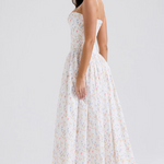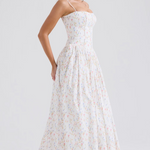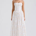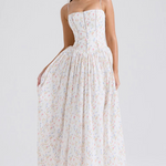 Елегантна цветна рокля, която подчертава женствеността с романтичен нюанс. Пригоденият корсет с вертикални шевове акцентира на силуета, докато широката пола осигурява комфорт и движение. Идеална за пролетни и летни поводи, от ежедневни разходки до елегантни покани.
