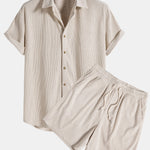 Този комплект от две части, изработен от смесен велур, включва риза с къс ръкав и чифт съчетаващи се шорти. Ризата разполага с класическо копче за закопчаване, а шортите са изрязани, за да съвпадат с горната част, създавайки унифициран вид. Тъканта има меко докосване и текстурирана повърхност, която предлага комфортен контакт с кожата.