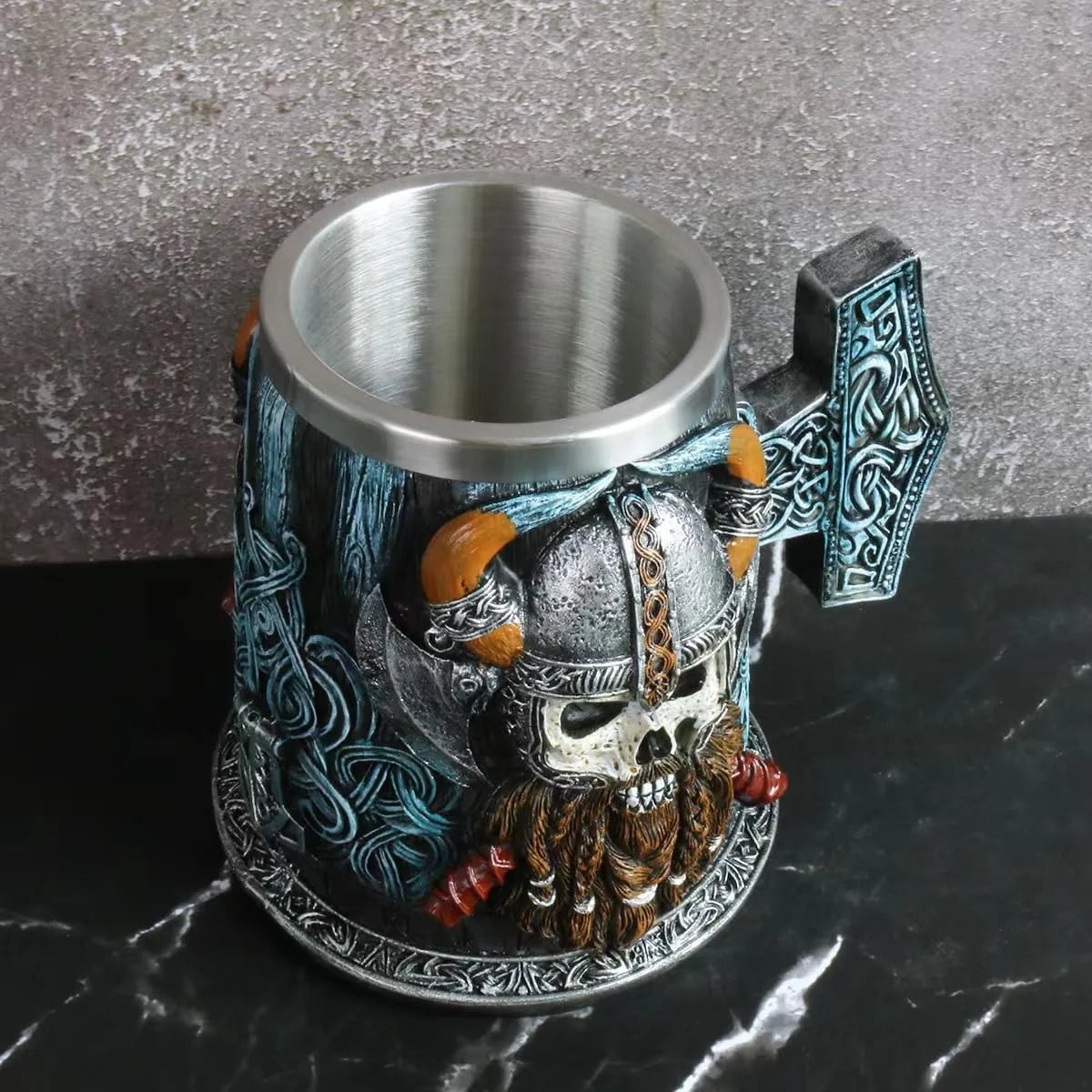 Започнете деня с непоколебимата сила на викинга с тази уникална чаша. Нейният дизайн с мотив на викингска пиратска бикова шлема е майсторски изработен от издръжлива смола и вътрешна вложка от неръждаема стомана 304. Тази чаша не е просто съд за пиене, тя е колекционерски артикул и символ на вашата сила. Голямата вместимост от 18oz (приблизително 530ml) ще ви осигури, че ще се насладите на любимото си бира, кафе или друга напитка в пълна степен.