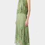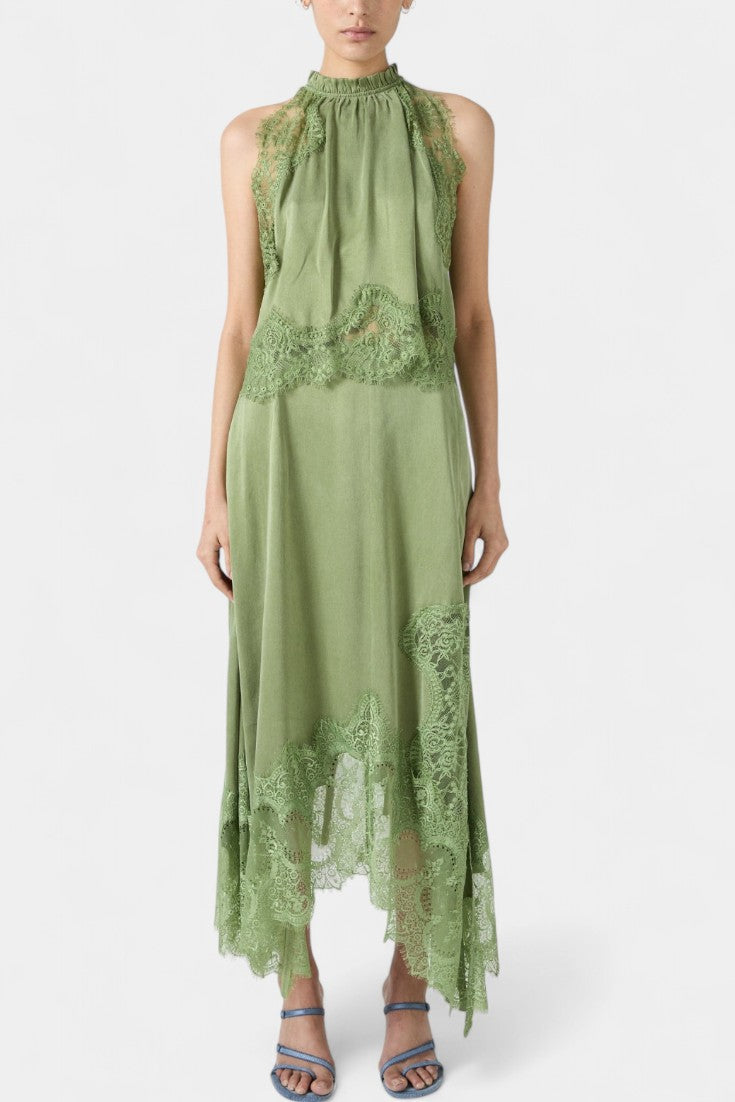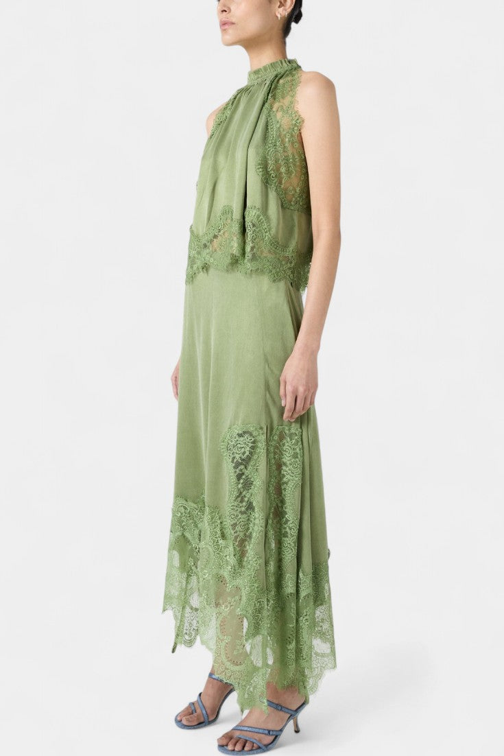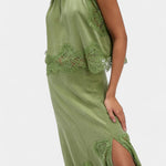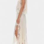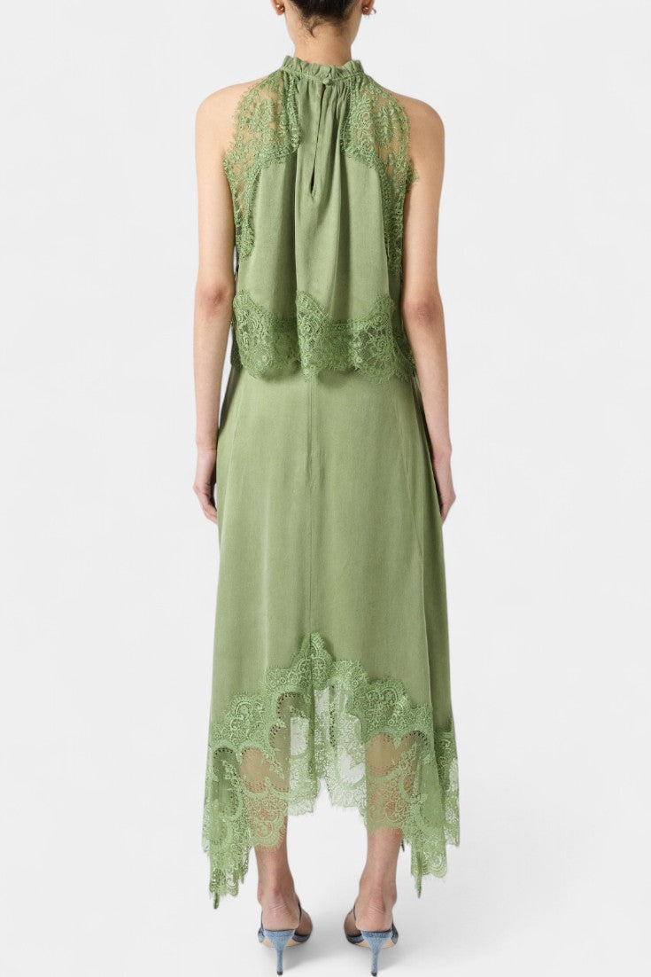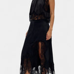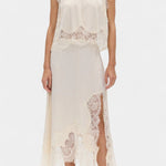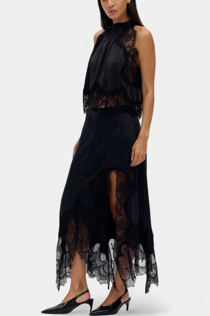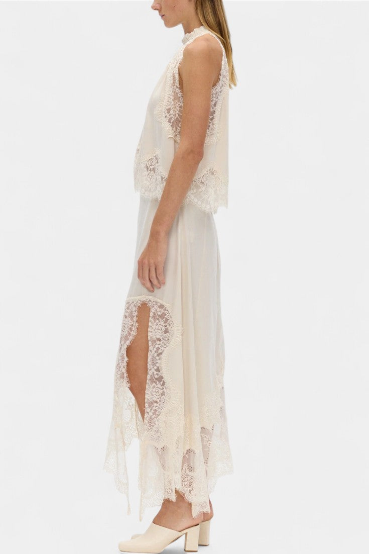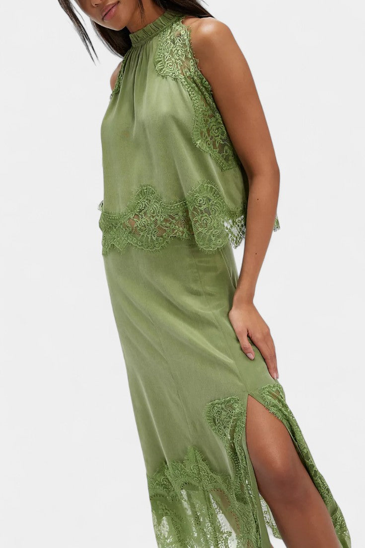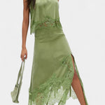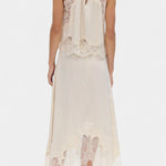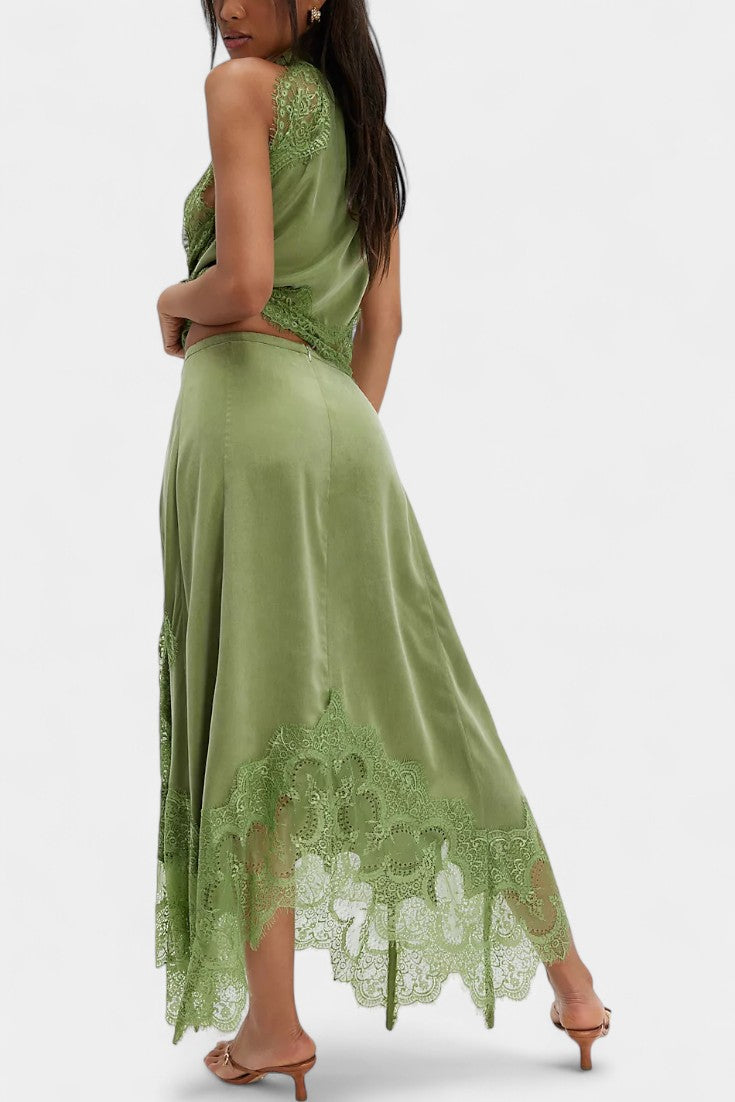 Комплект, който излъчва движение, свежест и безвременна изисканост. Нада комбинира миди пола с деликатни дантелени панели и асиметричен подгъв, който придава флуидност на всяка стъпка, с подходящ топ, който балансира елегантността и модерността.