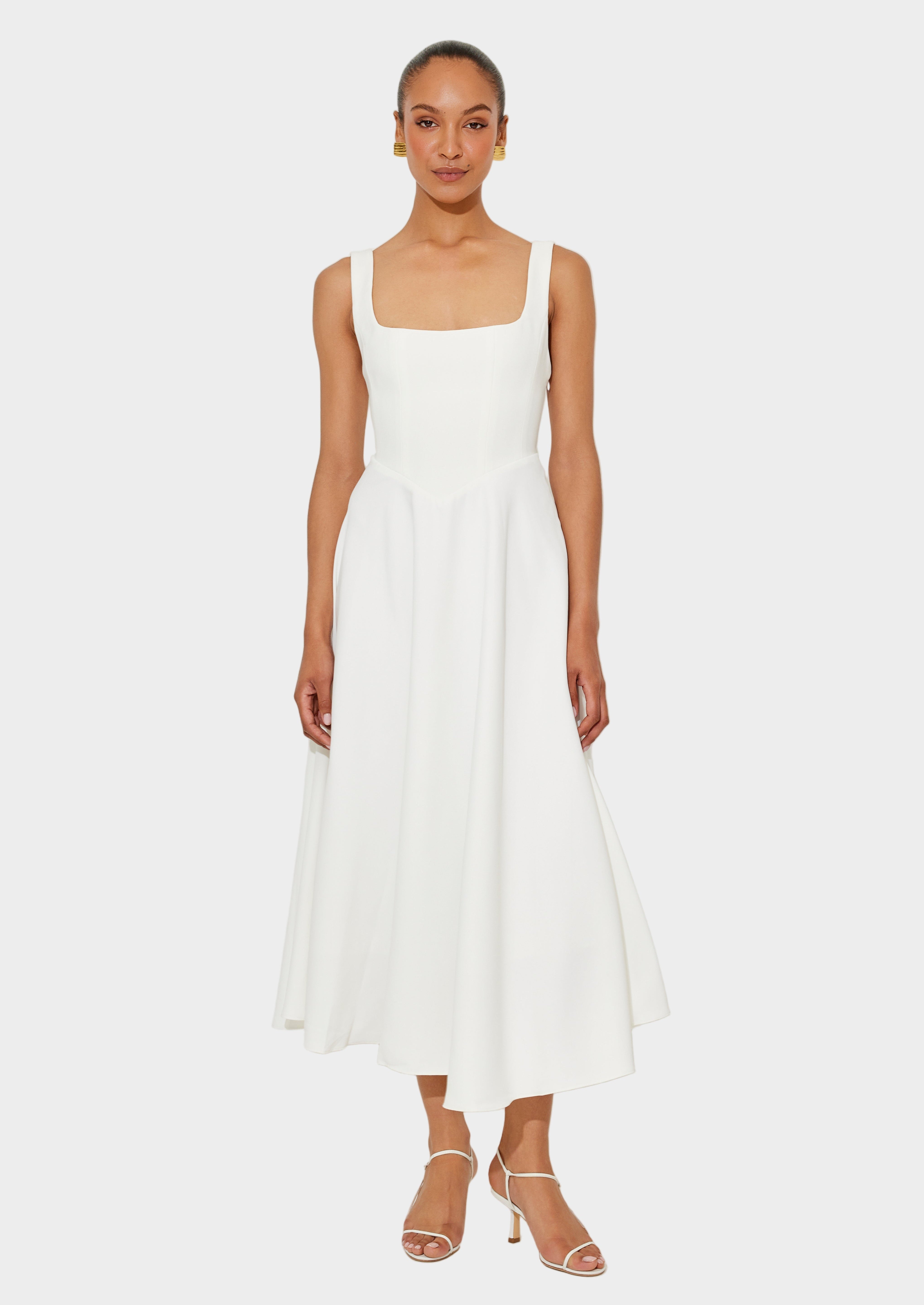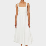 Издигнете своята елегантност и вечност с тази бяла миди рокля в минималистичен стил. Нейната чиста дизайнерска линия, в комбинация с отличен кроеж, я прави идеален избор за официални и полуофициални поводи.