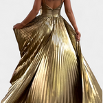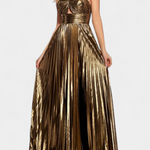 Роклята Бранимира блести с величествено присъствие благодарение на своя металик материал, преклоп и преден разкрой с стратегически набръчквания. Широката силуета елегантно пада до глезените, създавайки етерно движение с всяка стъпка. Парче, проектирано да се откроява под светлините и да оставя следа на всяко събитие.