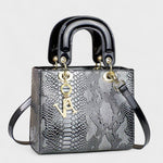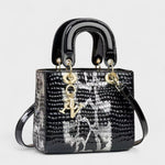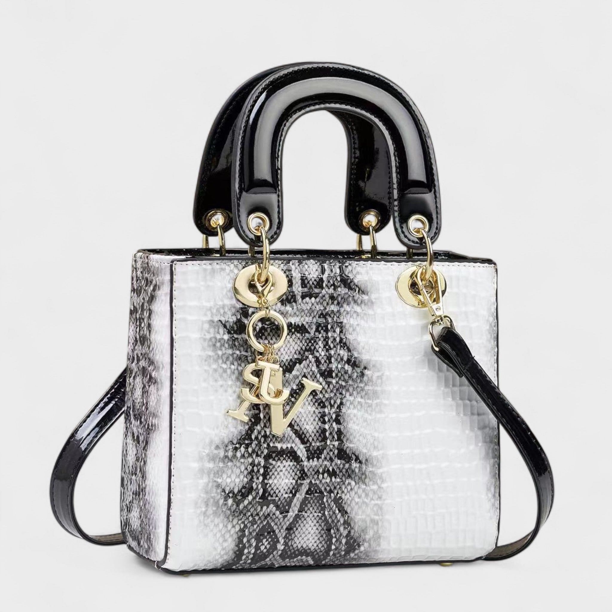 Със сложен завършек в животинска текстура и метални части с висок блясък, тази чанта е дефиниция на изисканост. Структурирана, с двойни дръжки и дълга сваляща се лента, предлага универсалност, която отговаря на формални събития до неформални моменти със стил. Аксесоар, който веднага повдига всяка комбинация, носейки чар и авторитет.