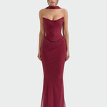 Елегантна и забележителна рокля без презрамки с прилепнал силует, който подчертава фигурата. Драпирани детайли на деколтето и връзване в стил корсет в талията добавят женственост и лукс, докато макси дължината предлага безвременна изтънченост. Идеална за вечерни излизания и тържествени поводи.
