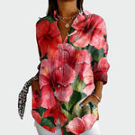 Риза с дълги ръкави и интензивни цветни десени в нюанси на червено и розово добавя жизненост и лятна атмосфера на всяка визия. Класическото яка и закопчаване отпред я правят универсална, идеална за неформални, но и по-елегантни поводи.
